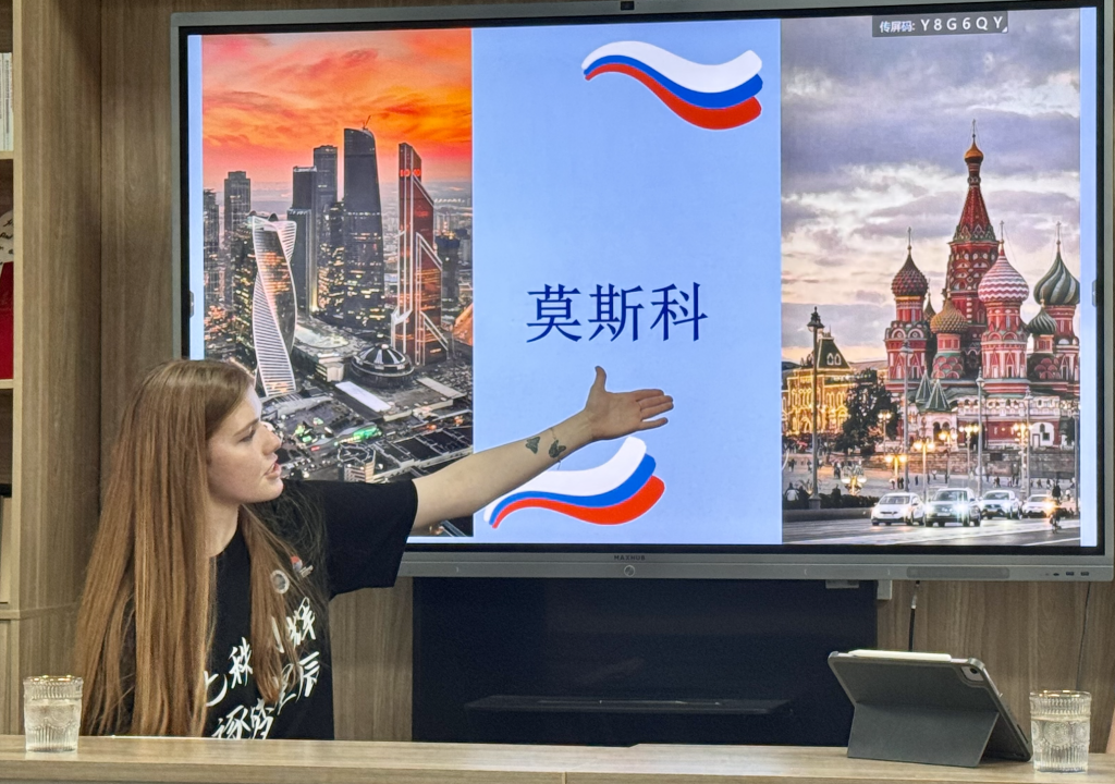 本次活动由来自国际学院的杨扬主持,特邀来自俄罗斯的留学生雅薇(Anastasiia Chugunova)作为嘉宾。雅薇以真诚而生动的讲述,带领现场师生走进了她的家乡莫斯科。她分享了自己在俄罗斯总统国民经济与公共管理学院(RANEPA)的学习经历,以及促使她来华学习中文、深入了解中国文化的初衷。在交流中,雅薇谈到了如何与中国同学建立友谊,并用俄语与俄语专业的学生互动,分享了关于赴俄留学的实用建议。她的经历与见闻让同学们对俄罗斯的教育与生活有了更直观的认识,也激发了大家对跨文化交流的兴趣与思考。