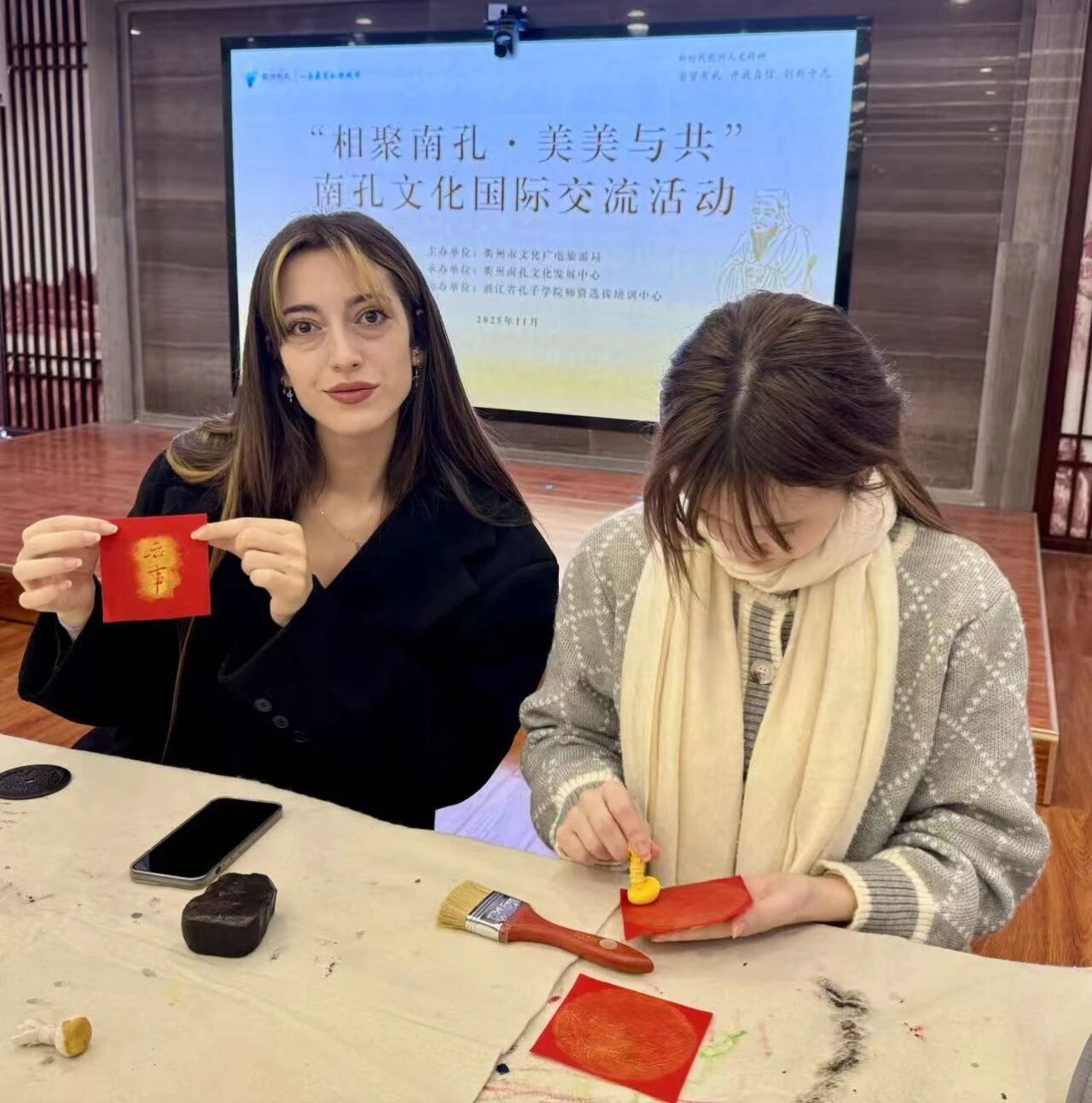 在中国儒学馆四楼培训教室,师生们亲身体验了传统拓印技艺。古朴的宣纸、淡淡的墨香,让来自法国和土耳其的同学们直呼“神奇”!