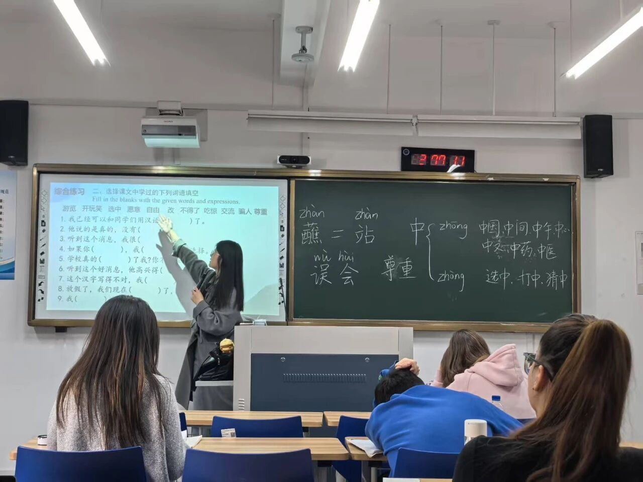 学院各教研室开展教师朋辈互助行动。学院资深教师一一走进年轻教师课堂,开展轮流听课,集中反馈,课堂教学能力提升行动,赋能年轻教师成长。国际中文教育米南老师针对初级A2班张以琳年轻教师听课后给予积极肯定,肯定其备课充分,语音标准,语速适中,课堂管理有效,出勤率高,并在后续上课的音量和课堂有效互动方面给出了中肯建议。冯烁老师针对中级A1课程的年轻教师在听课后也提出了有针对性的建议,比如提升中文话语量,减少中介语量,平衡好精读和泛读的比例,把握好进度和深度的关系等,年轻教师们纷纷点头并表示获益匪浅。