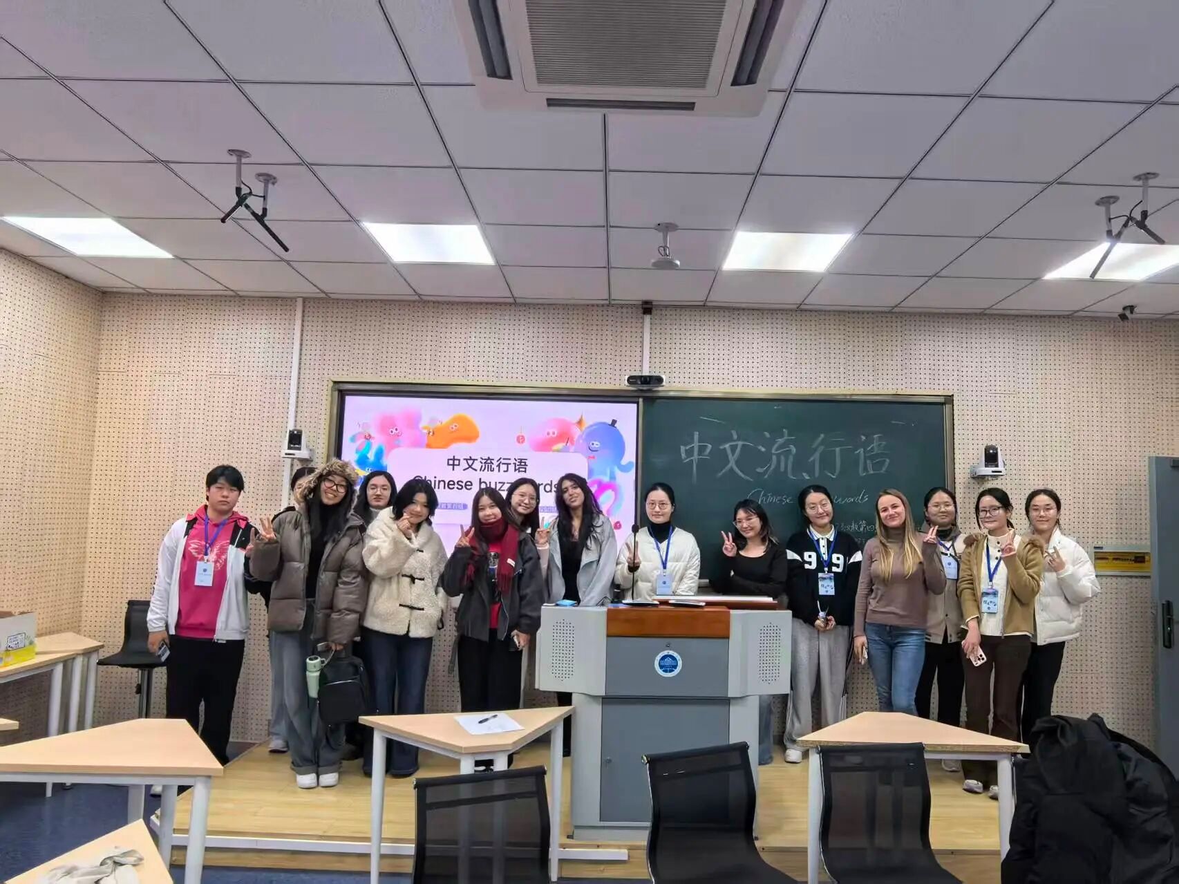 在望D223教室,一场关于“网络梗”的探索之旅正在火热进行。黑板上投影着“YYDS”“绝绝子”“破防了”等色彩鲜明的流行语,主讲人从“谐音梗”“影视梗”“社会心态词”三大来源入手,带留学生们跨越“课本中文”与“街头中文”的鸿沟。